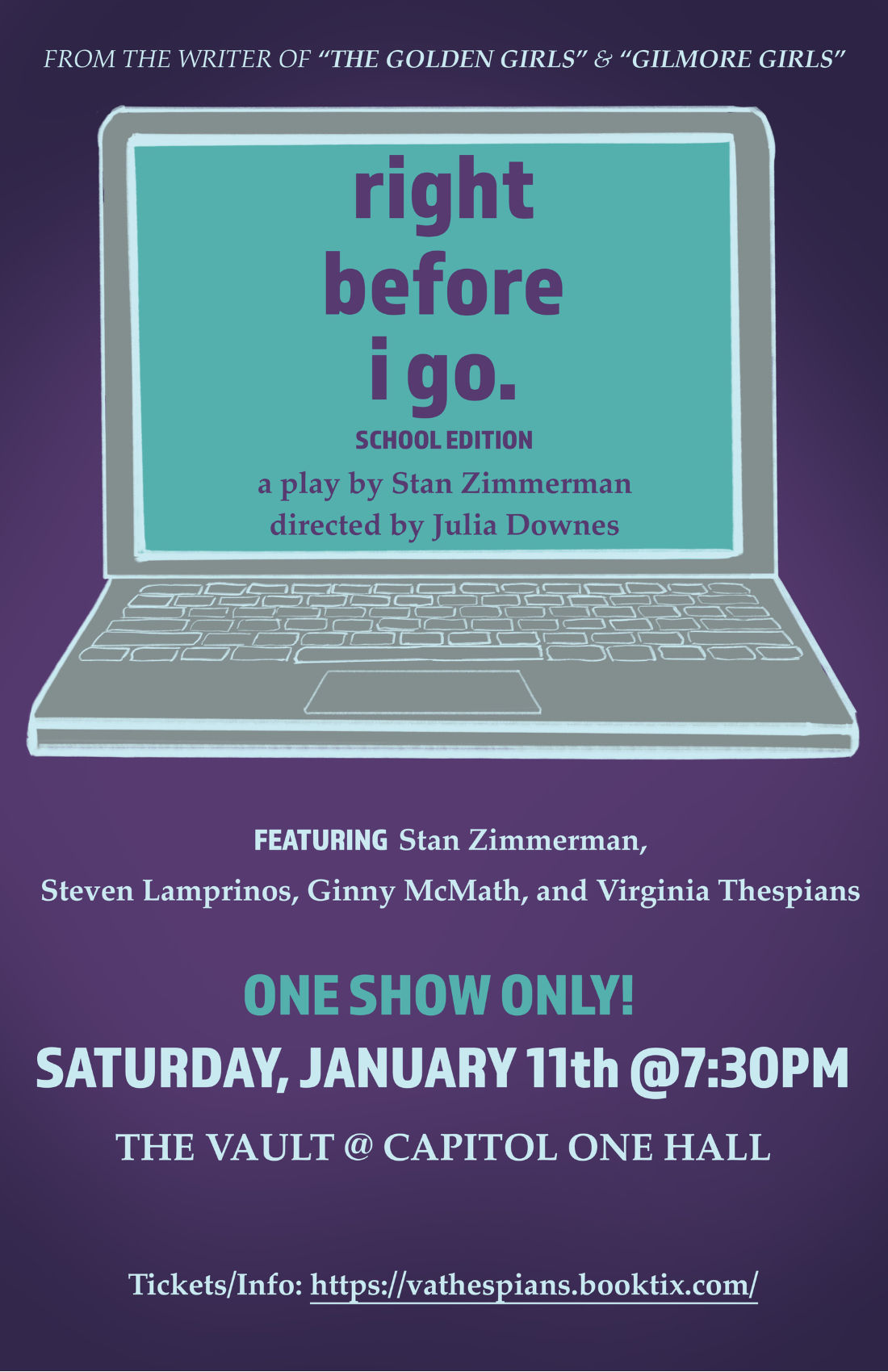 One performance around 2 pm for attendees and an extended performance open to attendees/ friends & family of the cast/ crew at 7:30 pm. For those commuting, we suggest you park in the C2 parking lot (first two hours free) for this performance. Enter the front entrance of the Capital One Hall and mention that you are here for the Virginia Thespian one act show.
